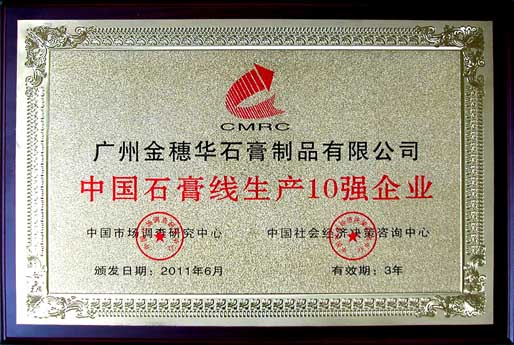 2011年6月,我公司榮獲由中國市場調查研究中心和中國社會經濟決策咨詢中心共同頒發的“中國石膏線生產10強企業”證書和獎牌。